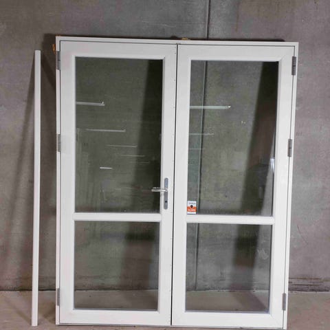 Gavl partisæt 344x373cm i træ/alu 2-lags energiruder og lavt alu bundstykke. Begge ellementer har en dobbelt terrasse dør og et fast fag øverst. Der medfølger en nøgle. Produceret af Kastrup. Det største element åbner venstre ud, og det mindste element åbner højre ud. Bredden på det store element er 175cm og højden er 285/373cm. det lille element er 169cm bredt og 288/373cm høj. Har brugspor samt skruehuller indvendig. De to dobbelt døre som også ses på billedet medfølger ikke.