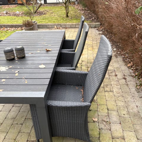 Havebord 105cm i diameter, med glas bordplade og flet understel + 3 plastikstole med fletryglæn. Som nyt, trænger til en klud.