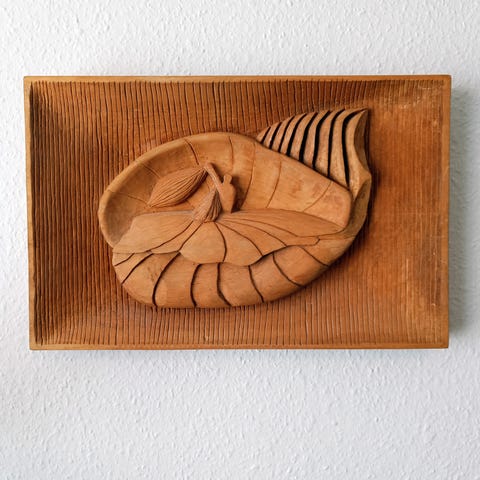 Relieffet er udført i en usædvanlig kombination af træ - dels gammelt moseeg, dels affaldstræ fra en ispindefabrik. Og gelænderet nederst på relieffet stammer fra Egeskov Slot.