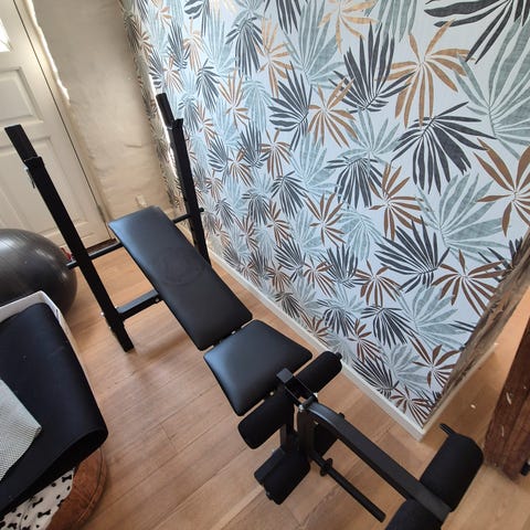 Træningsbænk med vægtstangsholder og justerbar rygstøtte