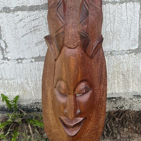 Afrikansk træmaske udført i sort træ med hvide dekorative mønstre. Masken har detaljerede udskæringer og et sløret ansigtsudtryk med lukkede øjne. Velegnet til vægophæng som dekorativt element. Håndlavet og købt i Tanzania.