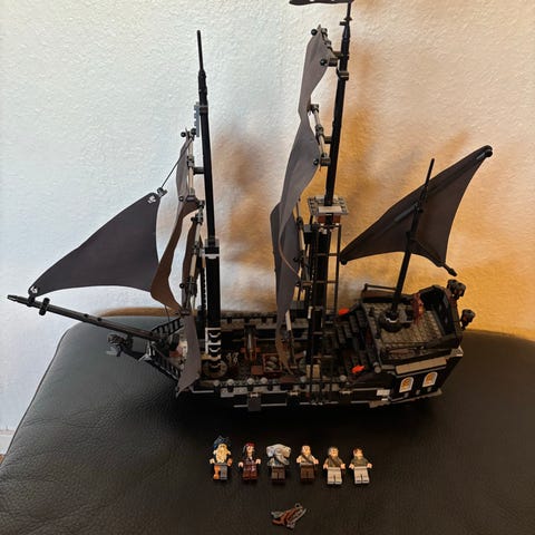 Queen Anne’s Revenge, nr.4195. Et virkelig flot eksemplar! Ingen dele mangler til selve skibet. Alle minifigurer medfølger også. Det eneste der mangler, er den lille fjer i ES’s hat (den skal være beige og ikke grøn). Manualer medfølger, ingen æske.