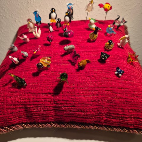 Samling af hattepinde med forskellige dekorative motiver såsom dyr, figurer og kugler. Pindene er lavet af metal med farverige og detaljerede hoveder i forskellige former. Velegnet til pyntning af hatte eller til samlerformål.