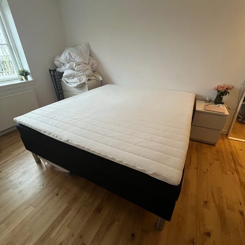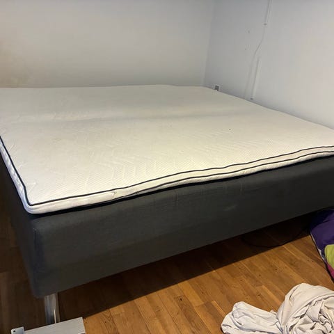 Det er den komplette seng: sengegavl, madras, topmadras og ben.