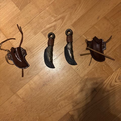 Dobbelt dekorativt knivsæt med ørnehoved, lavet i metal og træ. Knivene har en buet klinge og et håndtag formet som et ørnehoved. Sættet består af to knive.