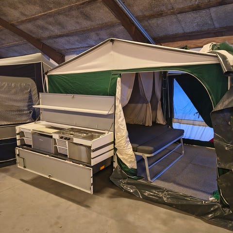 Køkken med køleskab og opbevaring samt håndvask og 3 gasblus, stor fortelt med gulvtæppe.