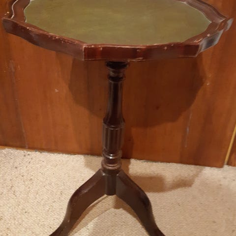 Rigtig fin, antik mørk blomsterbord. Måler 75x57x40. Med en skuffe.