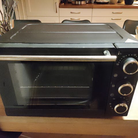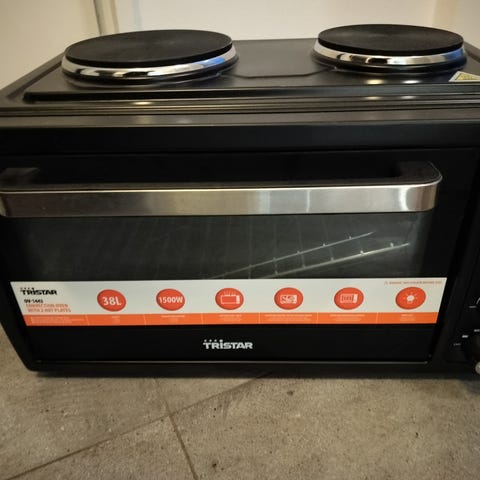 En praktisk miniovn med to kogeplader. Er næsten ikke brugt, men trænger til en klud, da den har stået på loftet.
