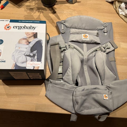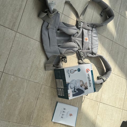 Ergobaby Omni 360 bæresele i sort farve. Designet til at bære børn i forskellige positioner med justerbare stropper og polstrede skulderbånd for komfort.