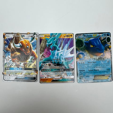Pokémon GX samlekort med forskellige karakterer inklusive Charizard, Blastoise, Charizard/ Braixen og Trevenant/Dusknoir. Kortene har holografiske detaljer og tilhører GX-serien. Kortene er de store og dermed mere værd.