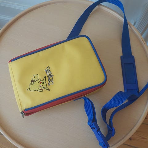 Indvendigt guldfarvet fór med lynlåslomme og Pokémon-label. Perfekt som statement-bag til festival, byture eller som samler-item.