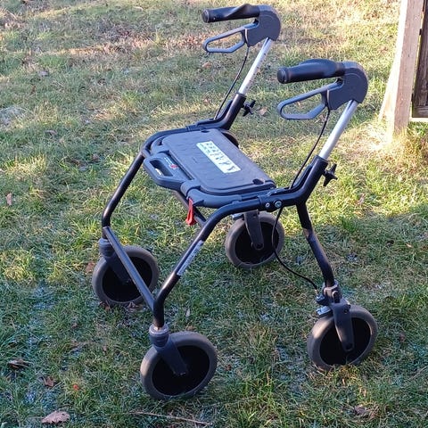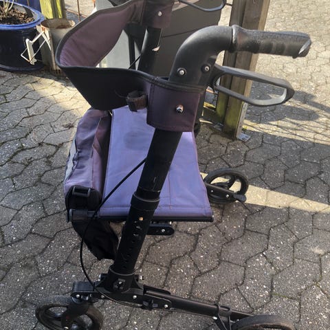 Sammenklappelig og let rollator med hvile sæde, kan højde indstilles og med dobbelt bremse/låsebremse.
