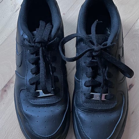 Sælger et par sorte Nike Air Force 1 Mid (all black) med ankel-strap. Klassisk mid-top model i sort læder med sorte snørebånd og sort sål – passer til alt.