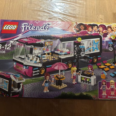 LEGO Friends legetøjsbus med rutsjebane og figurer. Sættet indeholder en bus med indretning, rutsjebane, og tilhørende figurer. Designet i farverne pink, lilla og hvid.