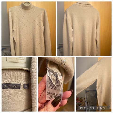 Stand: Standen er sat til god men brugt, og det skyldes at trøjen har været vasket nogle gange. Jeg ved ikke om perlemønstret foran tidligere har været symmetrisk og om der mangler nogle perler? I al fald sælges den som den ser ud her på billederne.