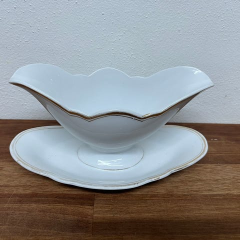 2 ens hvide porcelæns sovsekander, klassisk form, højde 10 cm, længde 22 cm.