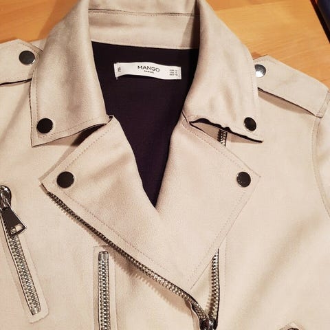 Klassisk bikerjakke fra Mango i ægte læder (100% sheep/lammeskind). Sort, kort model med asymmetrisk lynlås, flere lynlåslommer og bælte i livet. Tidløst “rock-chic” snit, der passer til både jeans, kjoler og støvler.