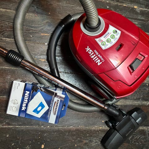 Nilfisk Coupé støvsuger med blå og sort design. Velegnet til rengøring i hjemmet eller mindre erhvervsmiljøer.