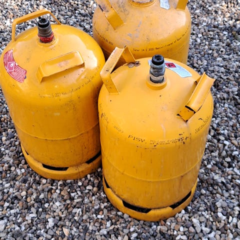 gasflasker, 4 stk. Anvendes til gasdrevne apparater som campingudstyr og lignende. Flaskerne er gule og beregnet til opbevaring og transport af gas. 11kg alle sammen er tomme og prisen er pr stk.