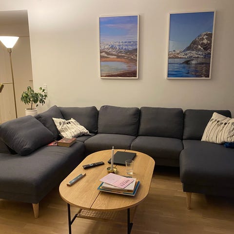U sofa i gråt stof