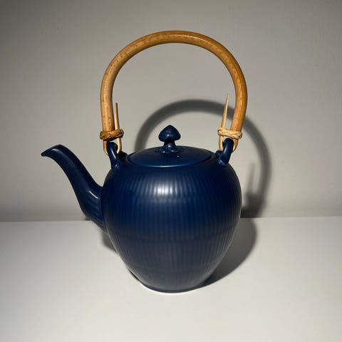 Rigtig fin Royal Copenhagen tekande i blå riflet design med bambushåndtag. Tekanden er designet til at brygge og servere te og har et klassisk, funktionelt design. Tekanden er aldrig brugt, og er en udgået Royal Copenhagen model nr. 140.