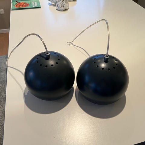 2 sølvfarvede kuglelamper med rødbrun inderside