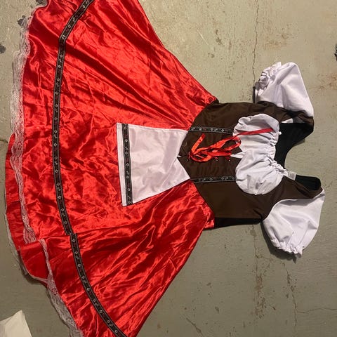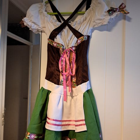 Kvinde kjole i blå og hvid ternet mønster med tilhørende hvid bluse. Kjolen har stropper og bælte i taljen. Blusen har korte pufærmer og rund hals. Str M