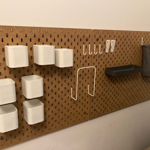 IKEA Pegboard vægpanel i hvid med forskellige tilbehør såsom hylder, kroge og holdere. Panelet har et hulmønster til fleksibel montering af tilbehør. Materialet er robust og velegnet til opbevaring og organisering i hjemmet. Byd gerne
