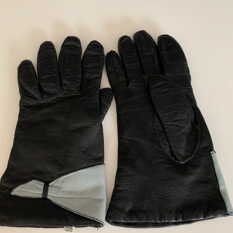 Sorte quiltet skindhandsker, kant med rævepels.
