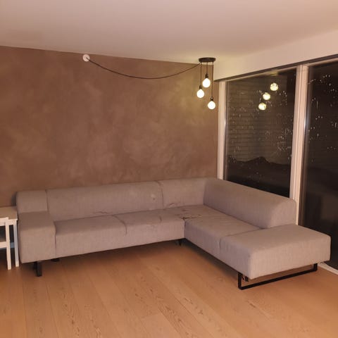Sofaen er brugt, og slid ses på chaiselongen, hvor der er nogle huller. Vi har haft et tæppe over, det har fungeret fint.
