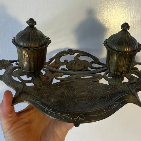 Antikt unikt kinesisk pennalhus i træ og dekoration med guld streger og maling