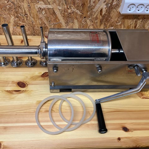 Pølsestopper 5 l. med alt tilbehør, 5 tude, 3 silicone ringe og brugsanvisning.
