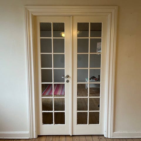 Der var to døre den ene har vi brugt som skillerumsvindue (se foto) for at få lys igennem til en gang.