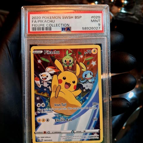 2020 Sword & Shield Pikachu Figure Collection Promo, i en PSA Mint 9. Enhver der har omgang med de boxe ved hvor svær den er at grade, da flertallet er skadet pga pakkemetoden og måden den bliver hægtet fast i blisteren fra fabrikken:) Prisen er fast indtil jeg selv justere op eller ned på den:) Jeg sender helst ud med GLS, når det gælder PSA slabs, da man kan føle sig mest tryg der efter min mening og ellers må man betale sit gebyr til DBA ved aftale med mig.. Mvh Dennis