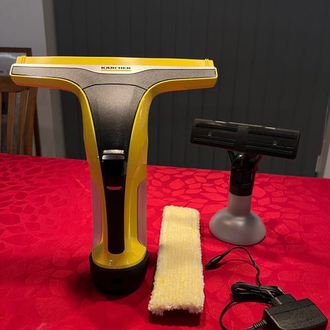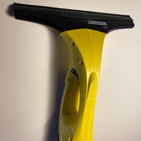 Kärcher WV 50 vinduesrenser i gul og sort farve. Elektrisk rengøringsredskab designet til effektiv rengøring af vinduer og glatte overflader. Udstyret med en aftagelig vandbeholder og ledning til strømforsyning.
