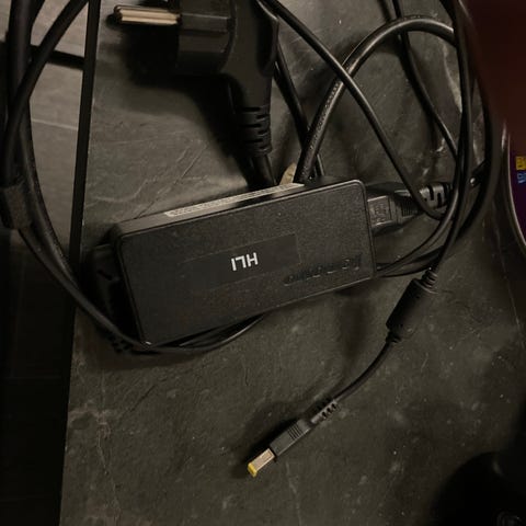 Lenovo Adapter til computer. Sort farve. Anvendes som strømforsyning til kompatible Lenovo computere. Kabel tilslutning med gul stikprop.