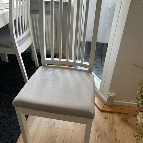 Hvide sæder/ryg med ben i mørkt træ – passer til mange typer spiseborde.