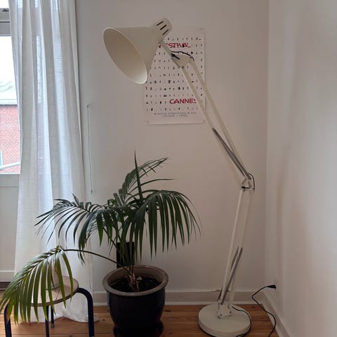 Messing farvet lampe i metal. Det er en storing flot lampe. Ingen brugsspor. Lyser super godt op, men jeg har ikke længere brug for den. Ikke ryger hjem. Måler ca 38 i diameter i lampeskærmen, og er ca 170 cm høj som den står med et “knæk”. Foden er a 35 cm i diameter.