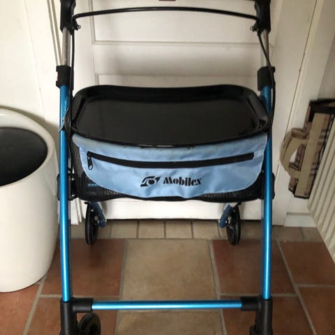 Som ny, kun brugt ganske lidt over et par måneder. Mobility Leopard rollator i sort. Rollatoren har fire hjul, en opbevaringspose og justerbar højde. Den er designet til støtte og mobilitetshjælp.