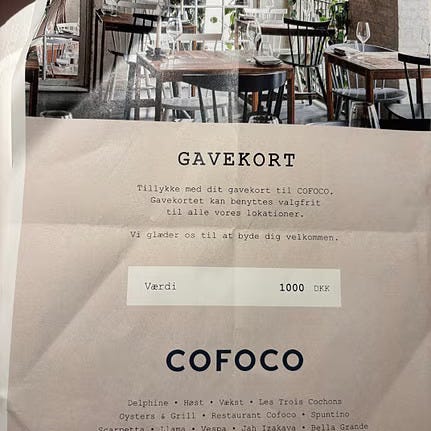 Gavekort til restaurant Köd til 600 kr. Jeg kommer aldrig til at spise i den restaurant. Kom forbi og hent. Gyldig indtil slut november 2026.