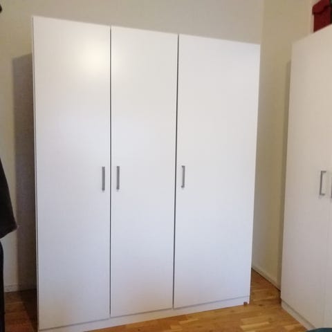 Gammelt hvidt klædeskab med spejl på midterste dør. Skabet har tre døre, indvendige hylder og en bøjlestang til ophængning af tøj. Det er tungt, men kan deles op i sektioner - uden værktøj.