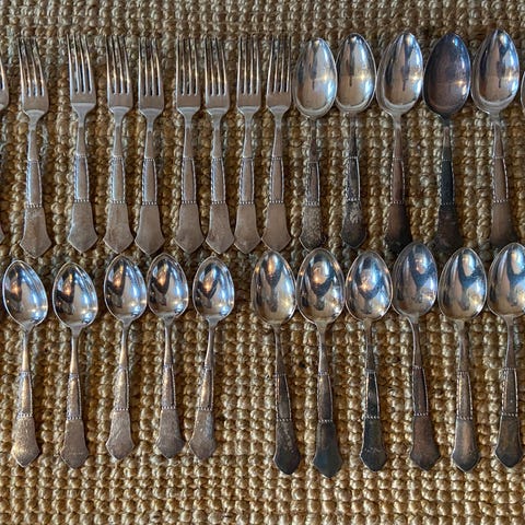 Bestikket har fine organiske detaljer og en smuk patina, som passer perfekt til både brug, samling eller dekoration.