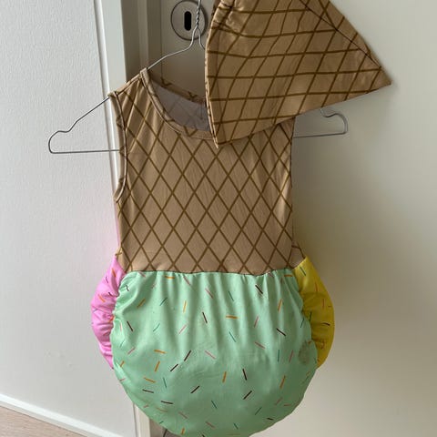 Isvaffel med 3 kugler og krymmel dragt str 98-104. Udklædning kostume. Der står str 86/92 i, men det virker større, især i bredden.