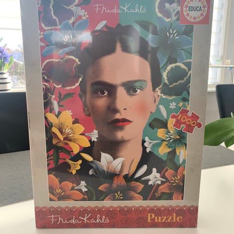 Dinner with Frida puslespil med 1000 brikker. Puslespillet forestiller forskellige scener og personer i forbindelse med Frida Kahlo. Materialet er pap, og puslespillet er velegnet til voksne og ældre børn.