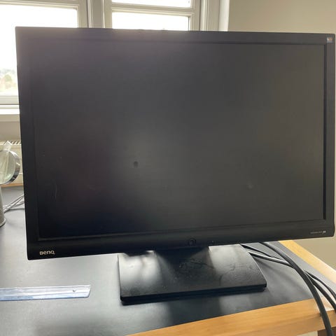 BenQ 24 tommer skærm med sort ramme og rund fod. Skærmen er egnet til brug som computerskærm til forskellige formål.
