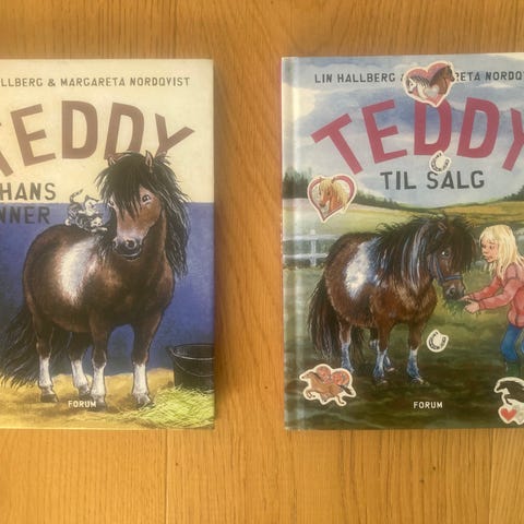 Teddy børnebøger med titlerne 'Teddy til salg' og 'Teddy i huset'. Bøgerne har illustrerede omslag med motiver af børn og dyr.
