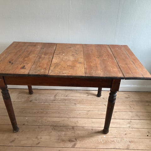 Antikt bord i egetræ med rundet bordplade og klapfunktion. Bordet kan foldes ud på begge sider for at give ekstra bordplads.