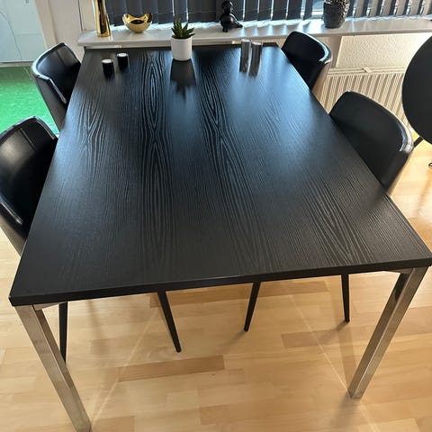 8 kantet bord med tillægsplade og fire stole.