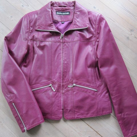Skindjakke, str. 38, Brock, Fuchia, Lammeskind, Næsten som ny, Jakke i str. 38. Brock Leather i Fuchia farve. Lækkert blødt lammeskind. Med lynlås foran og på ærmer som pynt. 2 indvendige lommer. Skåret i facon på ryg, så det giver en flot effekt. Er som ny, da den kun er brugt få gange.