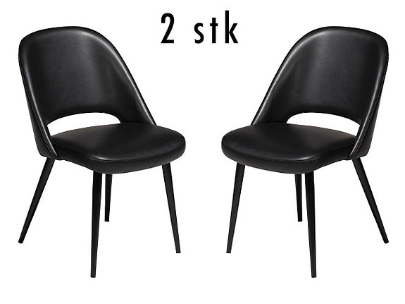 Spisestole med formbøjet skaller af beklædt med sort formspændt laminat, stel af forkromet metal, sæde betrukket med sort læder.